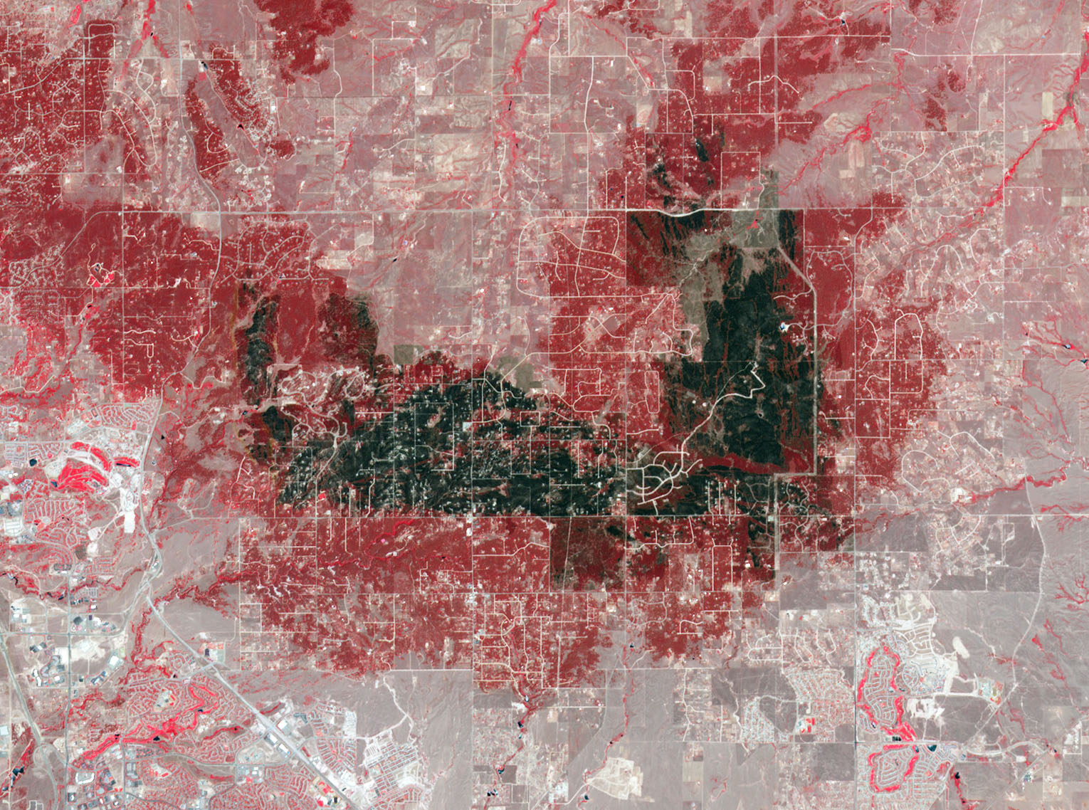 21 Haziran’ da Colorado’ da başlayan orman yangını, şimdiye kadar görülen en hasar verici yangın oldu Colorado için. Yanan yeşil olarak gösterilmiş. 14,000 dekar orman yangında kül olurken, 2 kişi öldü ve banliyölerde bulunan 500 ev yok oldu.