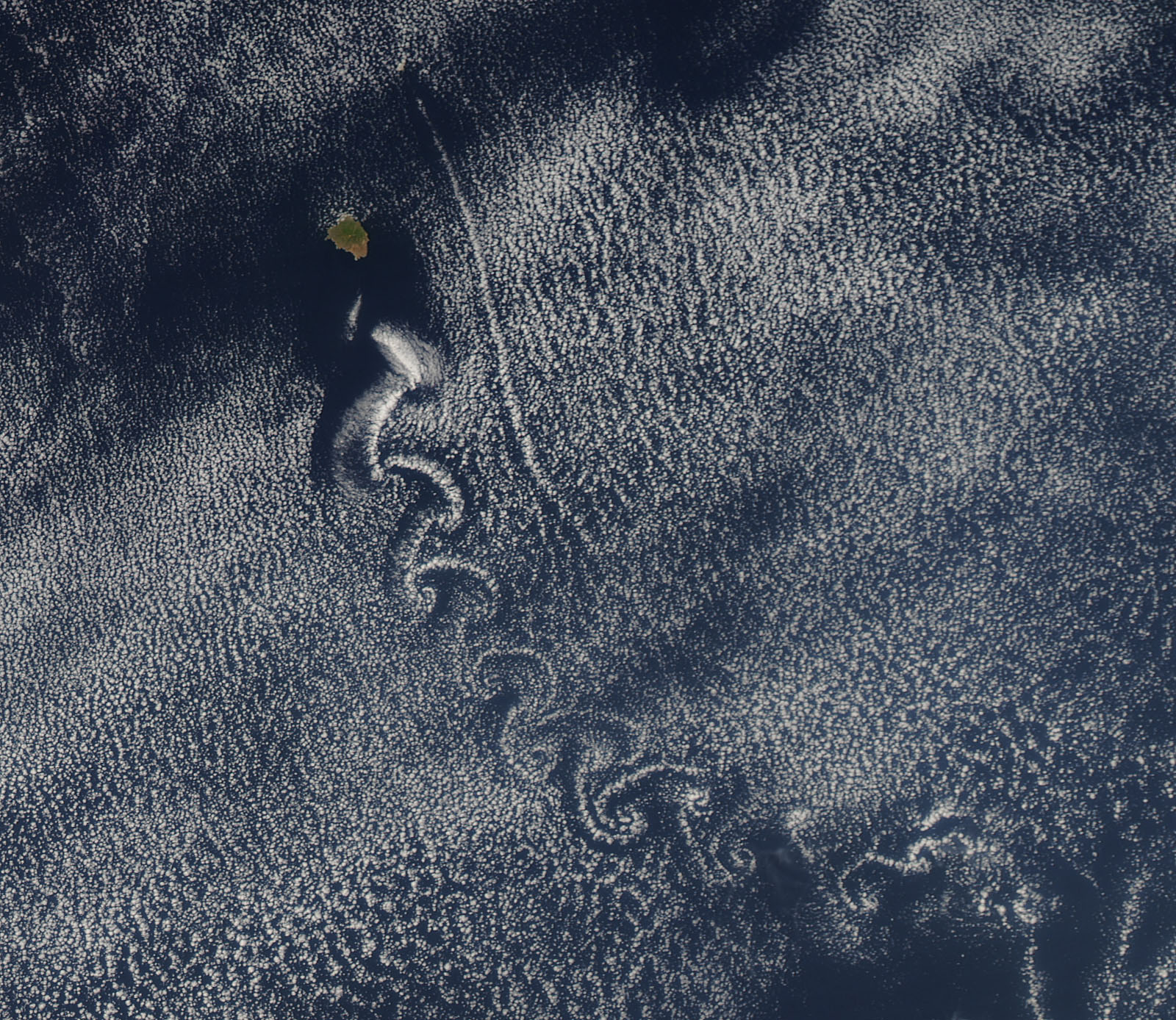 Küçük İspanyol adası Isal Socorro tarafından yapılan von Karman vorteksleri NASA Aqua uydusu tarafından 22 Mayıs 2013’te böyle görüntülendi.