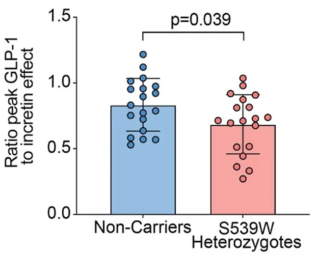 Şaşırtıcı bir şekilde, varyantı taşıyanların sistemlerinde bol miktarda GLP-1 olduğu görüldü. p.S539W’nin GLP-1 direnci yarattığı ve hormonun vücut tarafından düzgün bir şekilde işlenmesini engellediği ortaya çıktı.